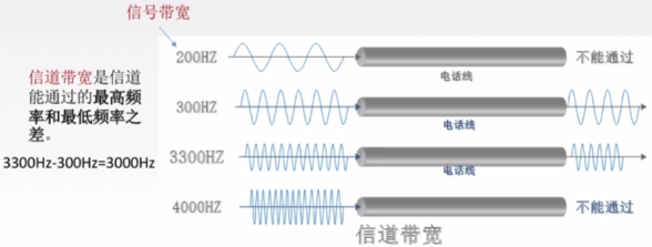 二者的关系:若一个码元携带n比特的信息量,则M波特率的码元传输速率所对应的信息传输速率为M×n比特/秒 - 带宽: