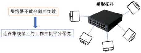 - 多台计算机必然会发生同时通信的情形,因此集线器不能分割冲突域,所有集线器的端口都属于同一个冲突域。集线器在一个时钟周期中只能传输一组信息,如果一台集线器连接的机器数目较多,且多台机器经常需要同时通信,那么将导致信息碰撞,使得集线器的工作效率很差。