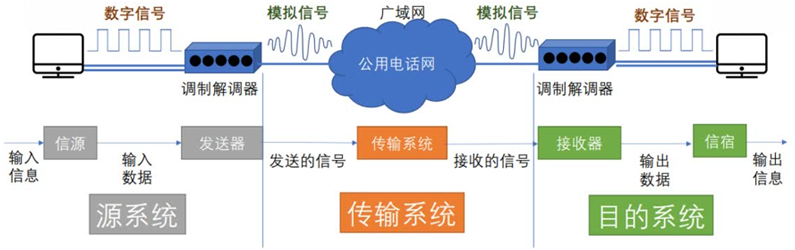 - 一个数据通信系统可划分为三大部分,即源系统(或发送端、发送方)、传输系统(或传输网络)和目的系统(或接收端、接收方)