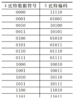 - 将欲发送数据流的每4位作为一组,然后按照4B/5B编码规则将其转换成相应的5位码。5位码共32中组合,但只采用其中的16种对应16种不同的4位码,其他的16种作为控制码(帧的开始和结束、线路的状态信息等)或保留。