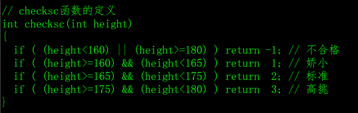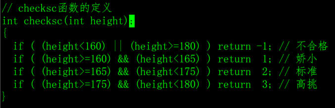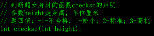 声明了一个函数,返回值是int类型,函数名是checksc,函数只有一个参数int height,注意,函数的声明语句最后的分号不能少。