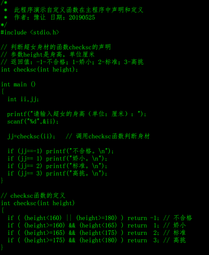 如果自定义函数只在调用者程序中使用,可以在调用者程序中声明和定义,声明一般为调用者程序的上部,定义一般在调用者程序的下部,这并不是C语言的规定,而是为了让程序更方便阅读,程序员约定的写法。