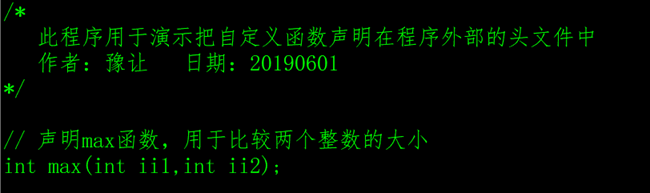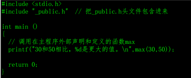 如果自定义函数是一个公共的功能模块,例如比较两个数的大小,就可以在其它的头文件中声明(如_public.h),调用者程序需要用#include预处理指令包含该函数声明的头文件。