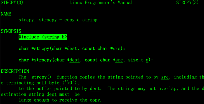 该包含哪些头文件呢?有两种方法,一是上百度上查资料,二是使用Linux系统提供的帮助,以strcpy函数为例,在命令行下输入man strcpy回车,如下: