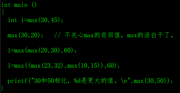 在C语言中,函数的调用非常灵活,可以独占一行语句,也可以当成常量赋值给变量,也可以当成函数的参数。