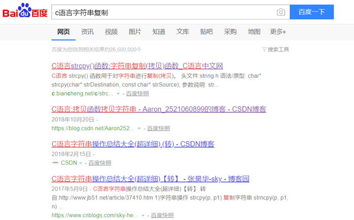 例如要查找C语言复制字符串功能的函数,在百度上输入“C语言复制字符串”搜索就可以了,你想查什么就输入什么。
