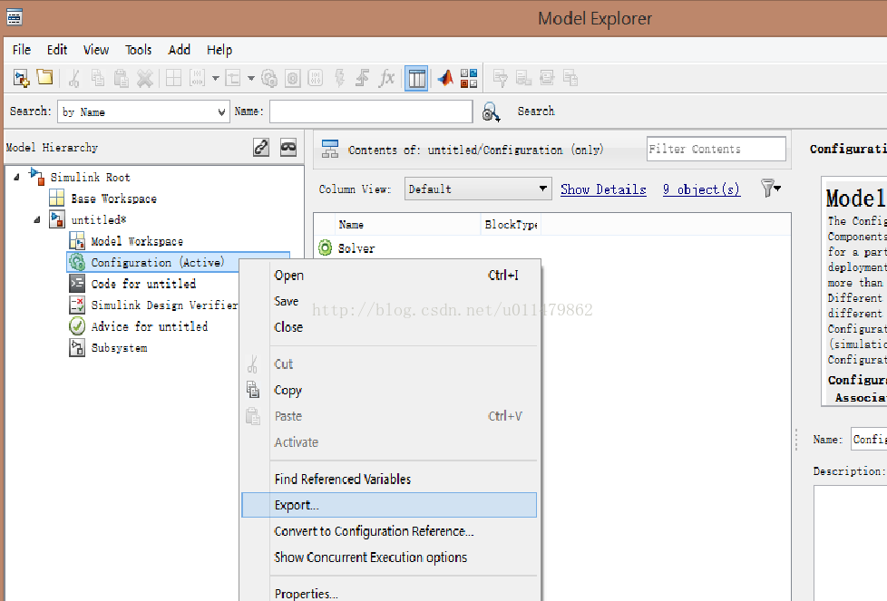 1. 将模型设置配置好后,进入Model Explore 中, 选中Configuration,右键后选择Export,生成一个M函数的文件。