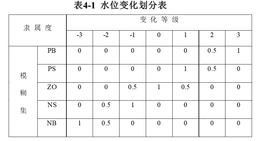 将偏差e分为五个模糊集:负大(NB),负小(NS),零(O),正小(PS),正大(PB)。根据偏差e的变化范围分为七个等级:-3,-2,-1,0,+1,+2,+3。得到水位变化模糊表4-1。