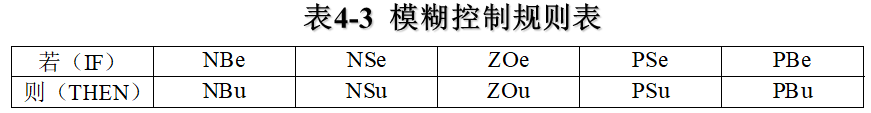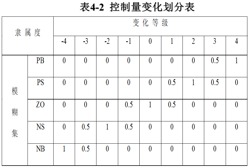 控制量u为调节阀门开度的变化。将其分为五个模糊集:负大(NB),负小(NS),零(ZO),正小(PS),正大(PB)。并将u的变化范围分为九个等级:-4,-3,-2,-1,0,+1,+2,+3,+4。得到控制量模糊划分表4-2。