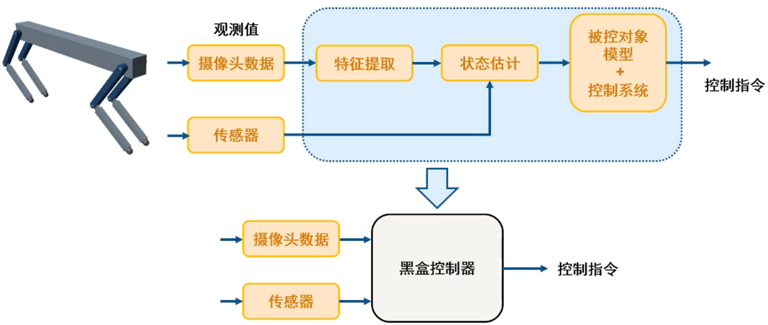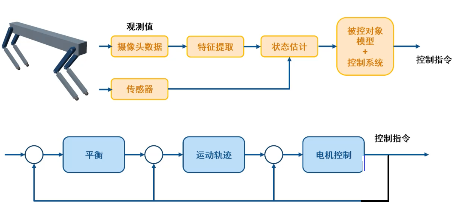包括三个环:平衡控制、运动轨迹控制、电机控制。传统的控制需要利用外部的视觉信号以及机器人的传感器获取环境及自身的状态信息,然后进行特征提取,从这些信息中获取有价值的信息,最后控制器根据机器人的外部及内部状态信息,由控制器计算得到控制输出,作用于被控对象。