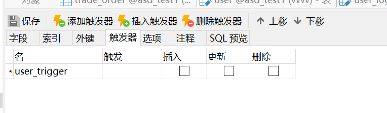 2.选中需要创建触发器的数据库表,点击设计表,会有触发器的标签出现,点击触发器,填写触发器名字