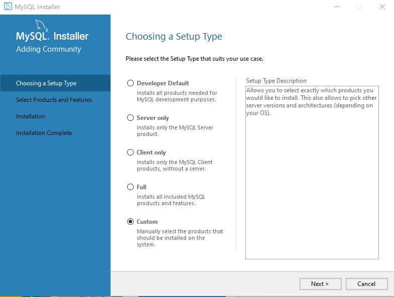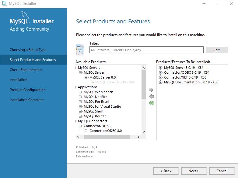 此处我安装选择的 Custom模式,自定义安装产品,勾选了MySQL Servers(注意需要展开到此节点的叶节点,然后根据电脑32位还是64位选择合适的节点,再添加到右边,点击下一步开始安装。)未勾选的选项,如果在将来想要安装,还可以再次运行msi,进行升级勾选。