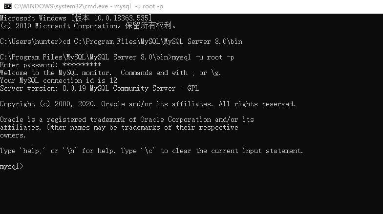 测试: cmd--》 mysql -u root -p回车输入安装时设置好的root用户的密码。