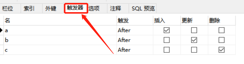 以上就是香蕉书包最近收集整理的关于使用Navicat 设定 sql 触发器的全部内容,更多相关使用Navicat内容请搜索靠谱客的其他文章。