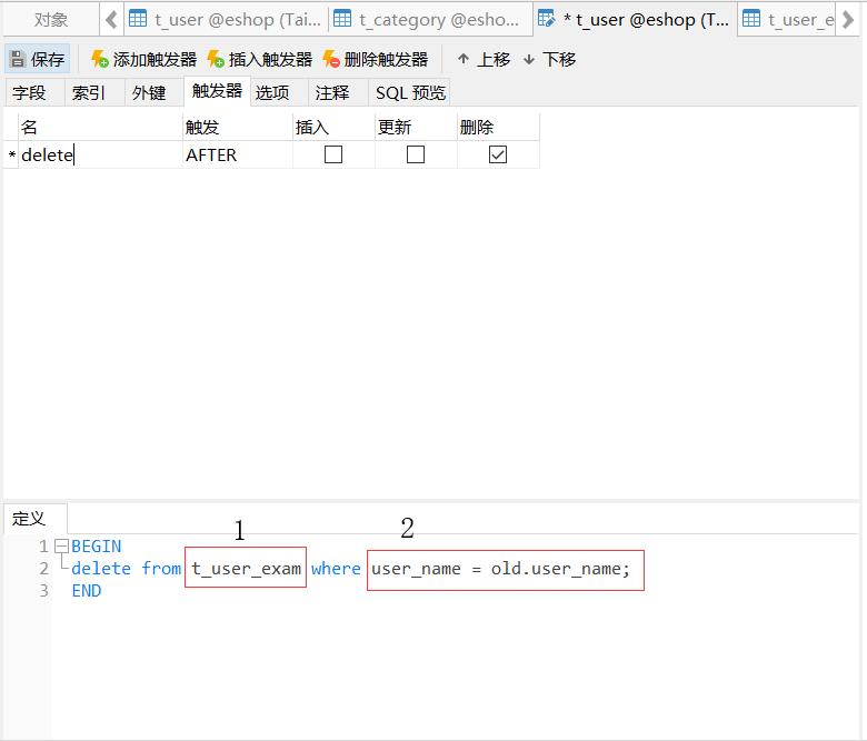 以上就是笨笨河马最近收集整理的关于Navicat下触发器的删除与插入操作的全部内容,更多相关Navicat下触发器内容请搜索靠谱客的其他文章。