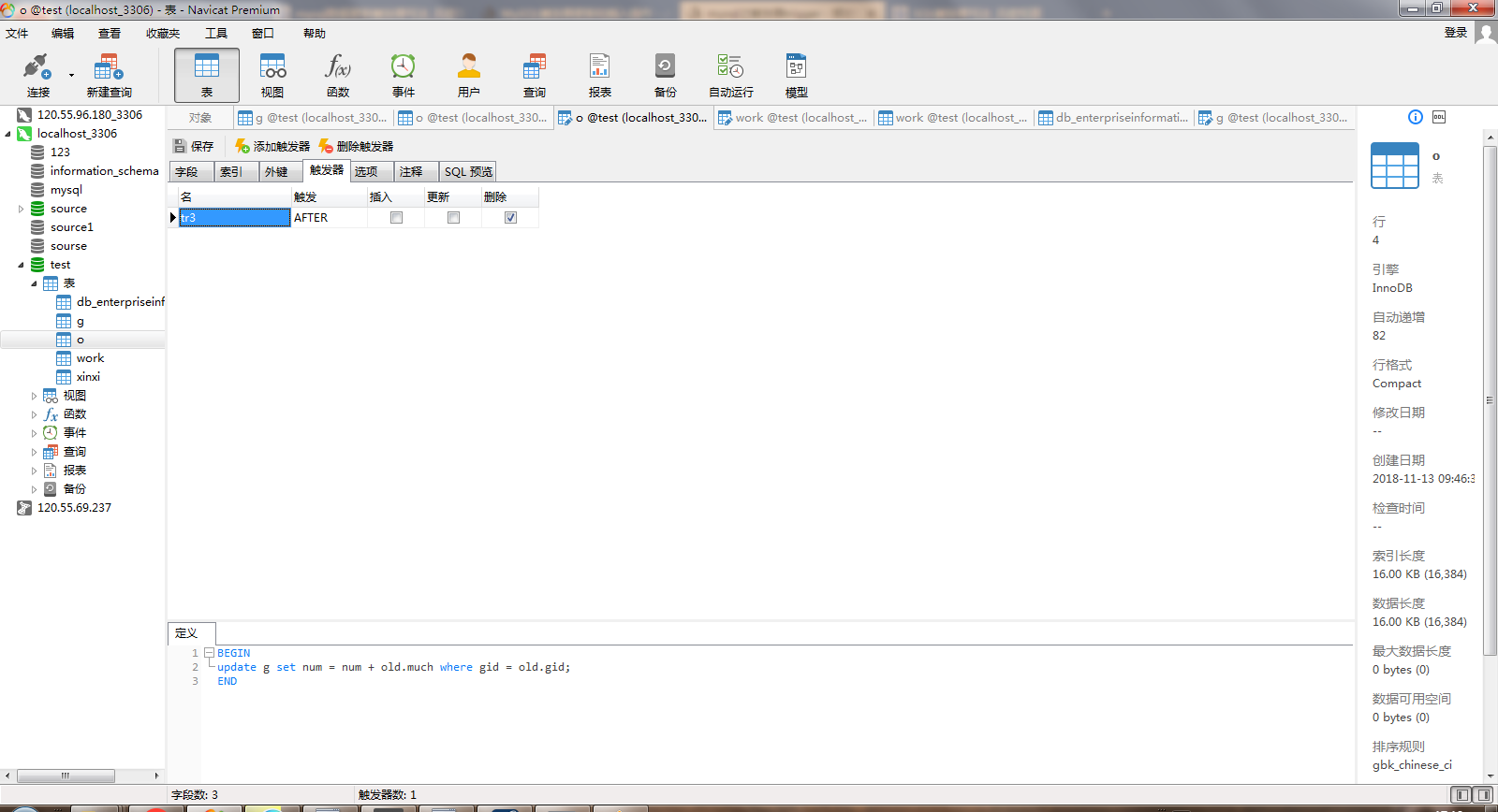 以上就是文艺猫咪最近收集整理的关于mysql命令行和navicat工具插入、删除触发器写法的全部内容,更多相关mysql命令行和navicat工具插入、删除触发器写法内容请搜索靠谱客的其他文章。
