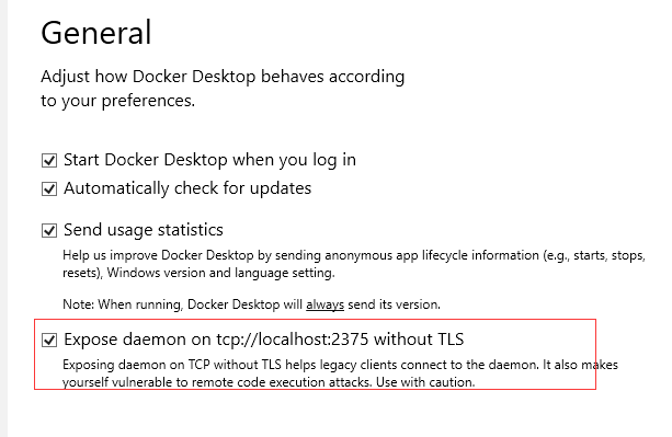 3.1 在wsl上安装docker 是跟 window系统的docker 共用一个 daemon 文件的。所以要在Windows上的docker setting 里面勾选上Expose daemon on tcp://localhost:2375 without TLS