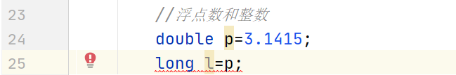 这样直接写会报错。double和long在内存上,都是使用64比特,但在存储机制上有差别,double还需要消耗一部分比特位用于存储浮点数,而long只用于存储整数。所以double往long里面装的时候,就会装不下。装不下,就要用强制转换。