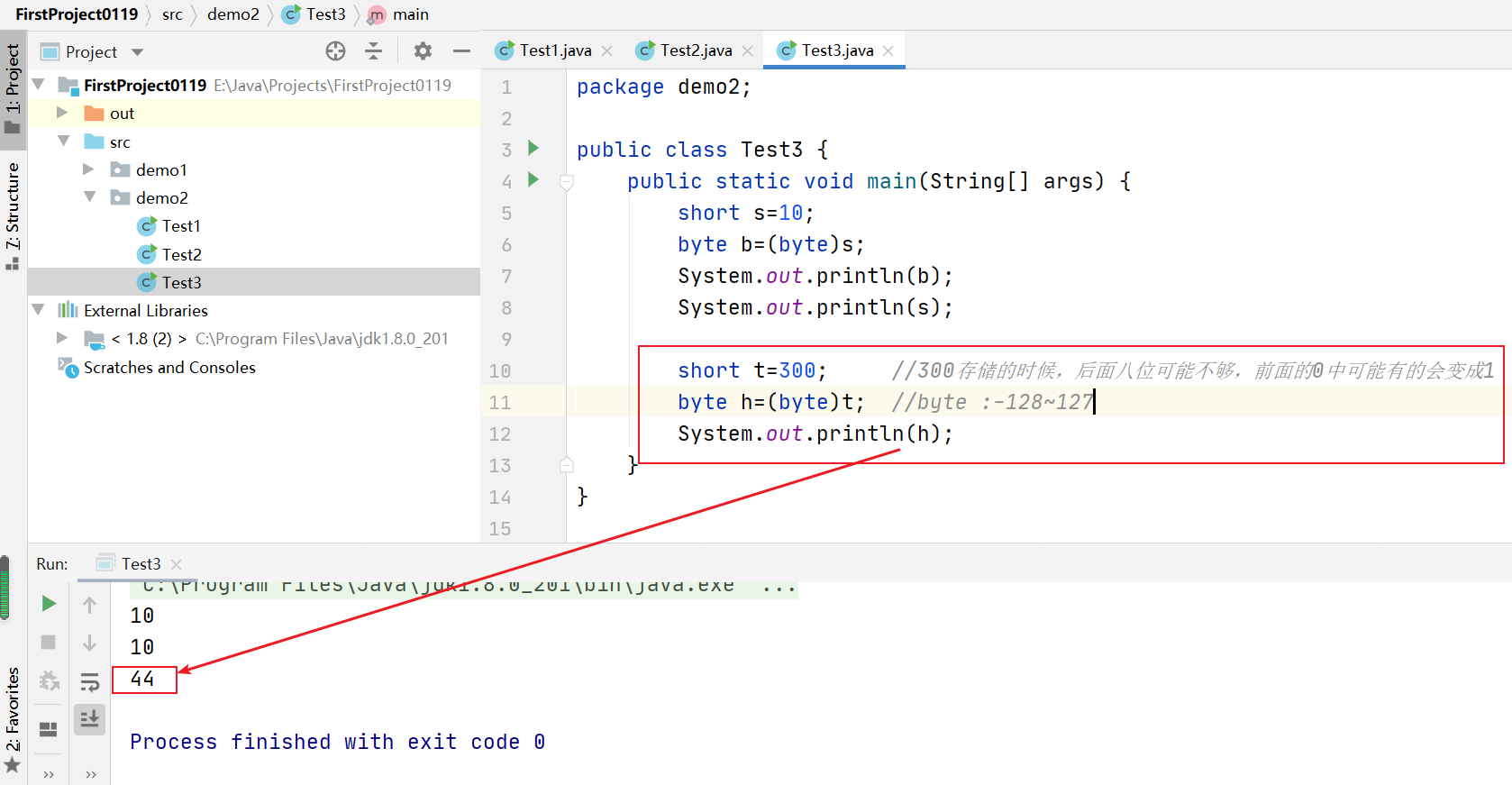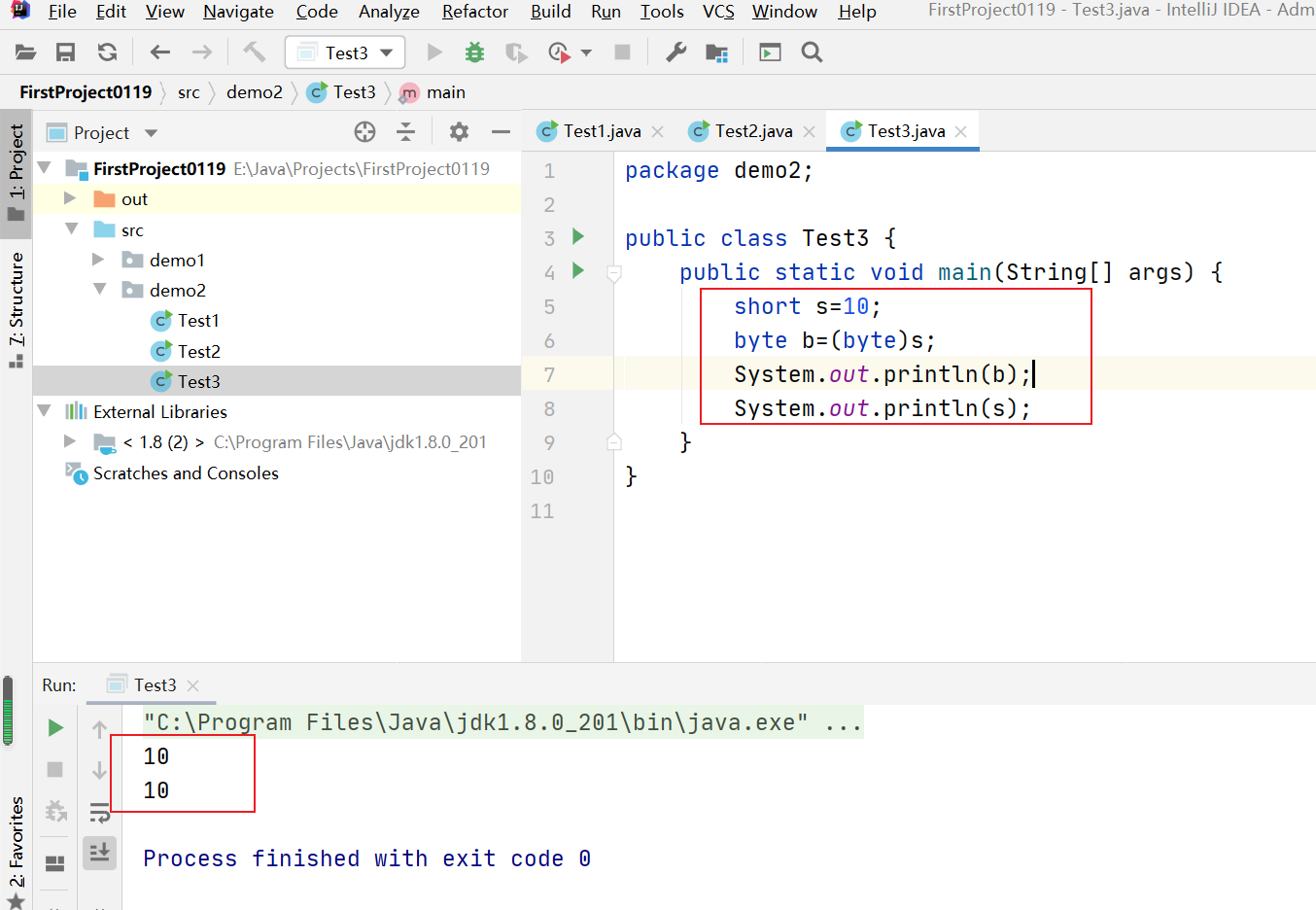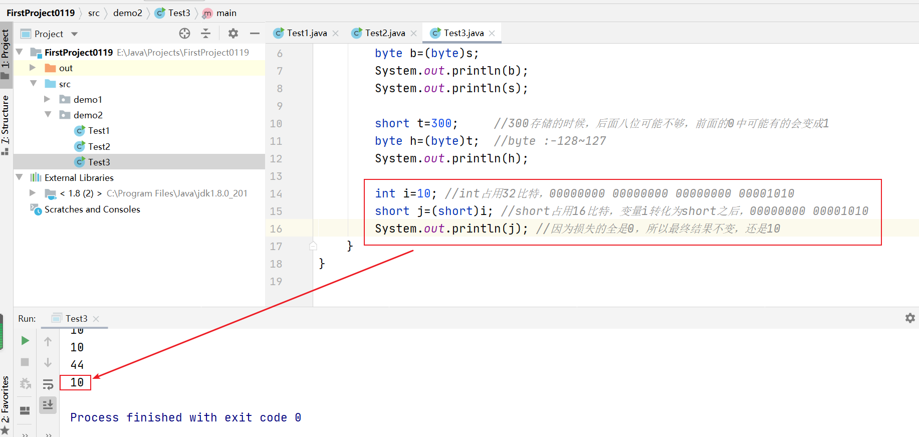 int i=10; //int占用32比特,00000000 00000000 00000000 00001010 short j=(short)i; //short占用16比特,变量i转化为short之后,00000000 00001010 System.out.println(j); //因为损失的全是0,所以最终结果不变,还是10
