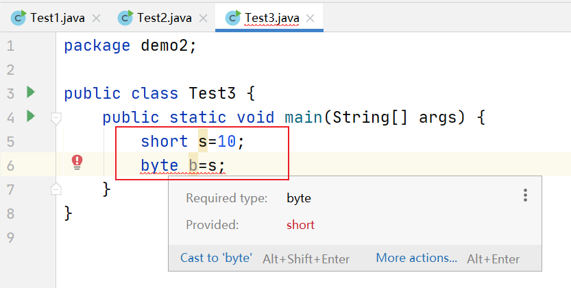 byte b=s; ---> b在内存上八位存储,而s是十六位存储。