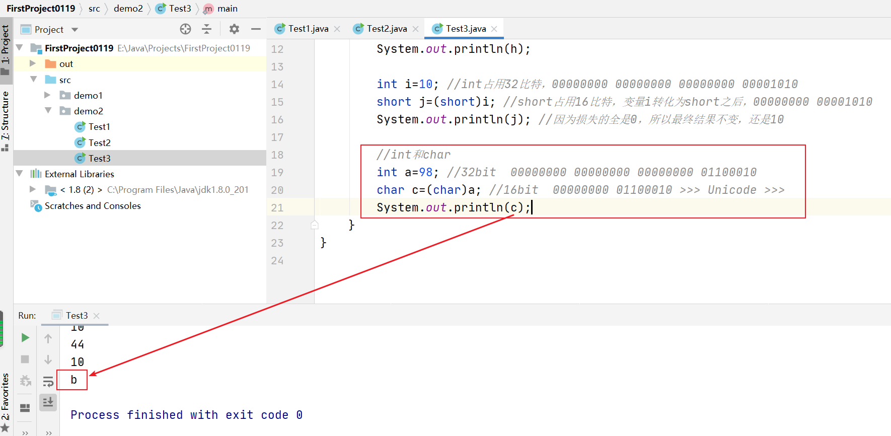 当浮点数转换成整数的时候,可以简单的认为,就是把小数位砍掉了,把整数位赋值给变量了。但是实际上,底层会复杂一点。我们在这里说的是宏观看到的效果。