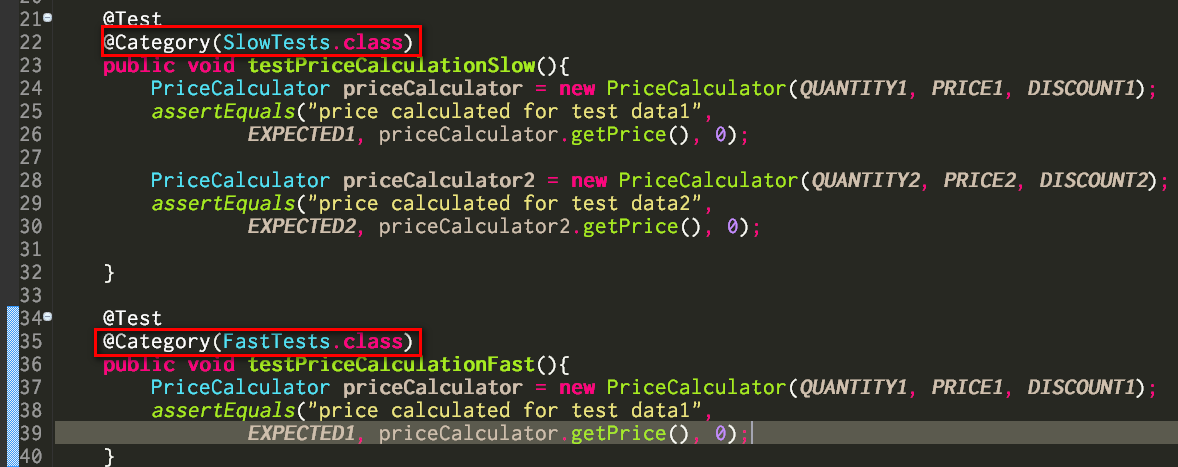 (2) In your test case class, categorize your test method using @Category annotation: