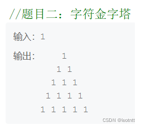 //题目二:字符金字塔 int main() { char ch = 0; scanf("%c", &ch); int i = 0; int j = 0; for (i = 0; i < 5; i++) { for (j = 0; j <= 5 - i; j++) { printf(" "); } for (j = 0; j <= i; j++) { printf("%c ", ch); } printf("n"); } return 0; }