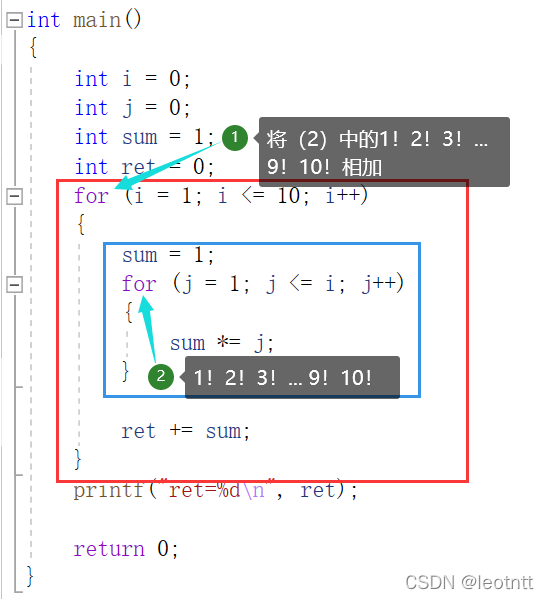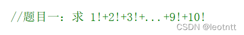 //题目一:求 1!+2!+3!+...+9!+10! #include <stdio.h> int main() { int i = 0; int j = 0; int sum = 1; int ret = 0; for (i = 1; i <= 10; i++) { sum = 1; for (j = 1; j <= i; j++) { sum *= j; } ret += sum; } printf("ret=%dn", ret); return 0; }