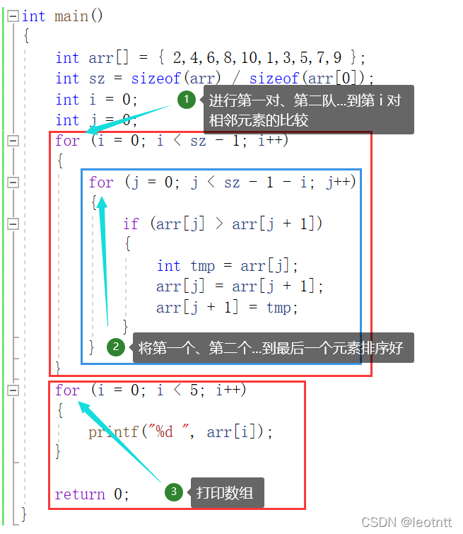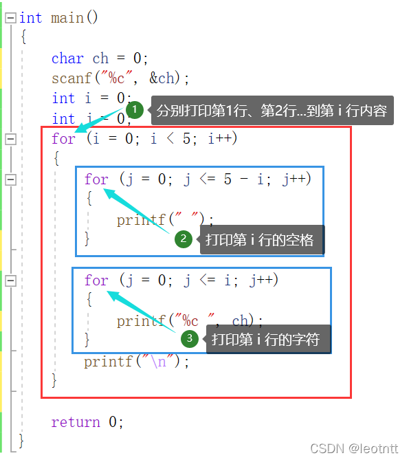 特别注意:for循环嵌套个for循环这类题,如果俩个for循环同时看,对于初学的同学来说很容易弄混淆,从而看不懂代码含义。有个好的方法是:先不看最外边的for循环,先看内部的for循环,很便于理解,先看 for(2) 后再看 for(1)。 //就这一句话,但是真的好用