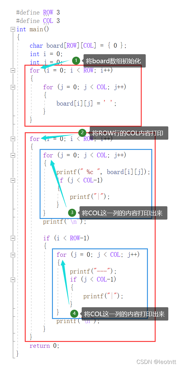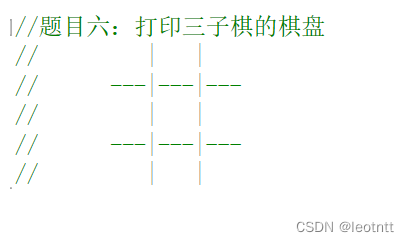 //题目六:打印三子棋的棋盘 // | | // ---|---|--- // | | // ---|---|--- // | | #define ROW 3 #define COL 3 int main() { char board[ROW][COL] = { 0 }; int i = 0; int j = 0; for (i = 0; i < ROW; i++) { for (j = 0; j < COL; j++) { board[i][j] = ' '; } } for (i = 0; i < ROW; i++) { for (j = 0; j < COL; j++) { printf(" %c ", board[i][j]); if (j < COL-1) { printf("|"); } } printf("n"); if (i < ROW-1) { for (j = 0; j < COL; j++) { printf("---"); if (j < COL-1) { printf("|"); } } printf("n"); } } return 0; }
