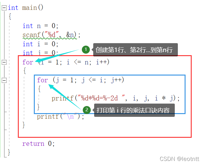 //题目四:打印乘法口诀表 int main() { int n = 0; scanf("%d", &n); int i = 0; int j = 0; for (i = 1; i <= n; i++) { for (j = 1; j <= i; j++) { printf("%d*%d=%-2d ", i, j, i * j); } printf("n"); } return 0; }