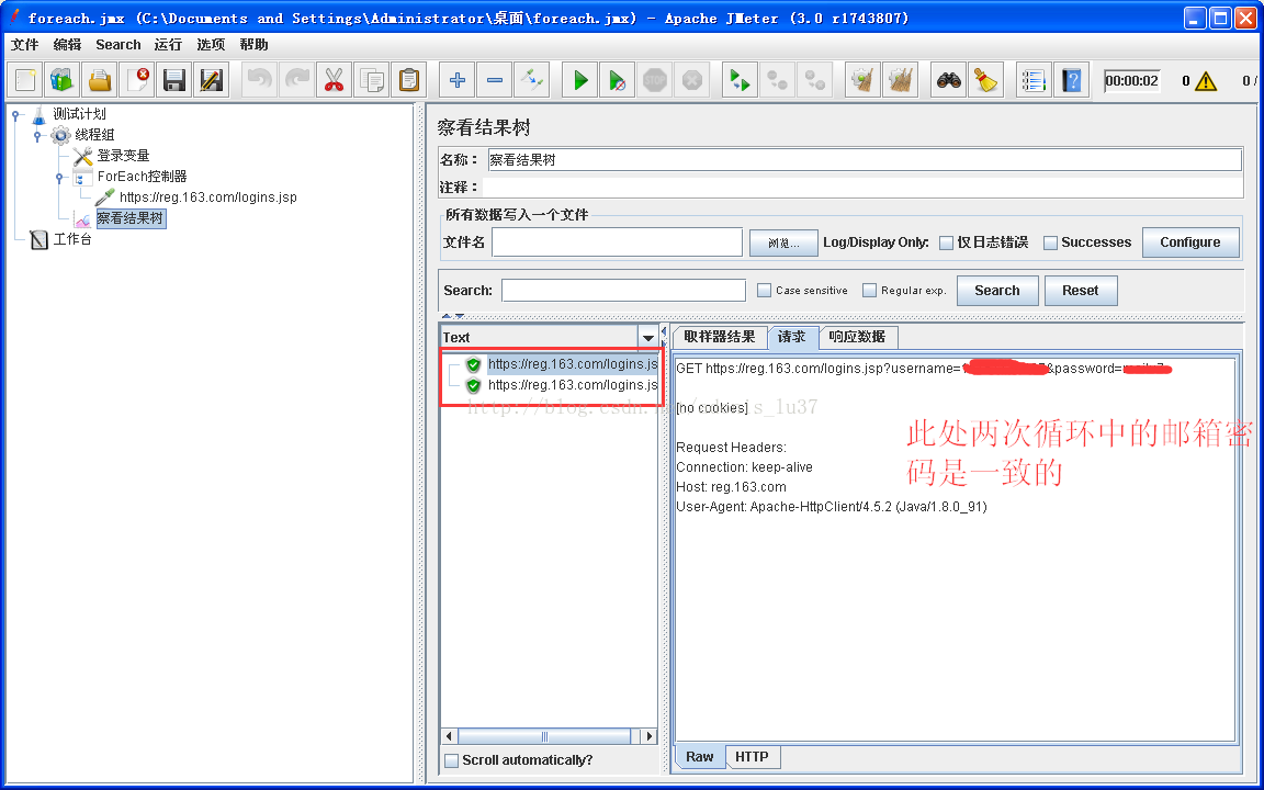 运行测试计划,在“察看结果树”中就可以看到,每次请求使用了不同的参数。