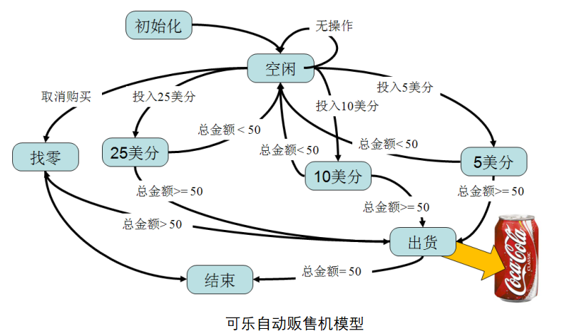 一般可以用状态图来对一个状态机进行精确地描述。大家请看这个可乐机的状态图 。