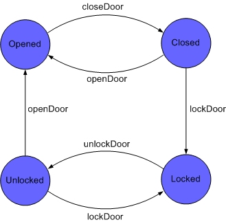 游戏引擎是有限状态机最为成功的应用领域之一,由于设计良好的状态机能够被用来取代部分的人工智能算法,因此游戏中的每个角色或者器件都有可能内嵌一个状态机。考虑RPG游戏中城门这样一个简单的对象,它具有打开(Opened)、关闭(Closed)、上锁(Locked)、解锁(Unlocked)四种状态。当玩家到达一个处于状态Locked的门时,如果此时他已经找到了用来开门的钥匙,那么他就可以利用它将门的当前状态转变为Unlocked,进一步还可以通过旋转门上的把手将其状态转变为Opened,从而成功地进入城内。