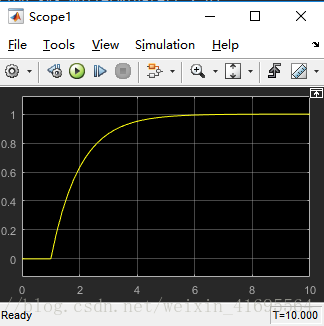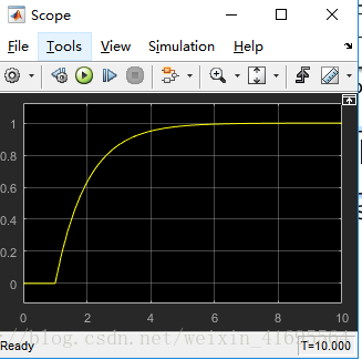 已知我们的状态空间方程为:dx=-x+u;y=x,对应的系统传递函数为G=1/(s+1),搭建模型如下所示: