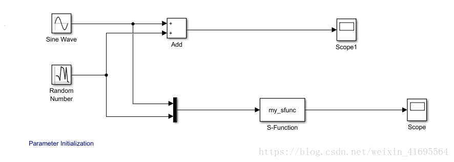 当然这非常的简单,用加法模块就可以完成,但是我想利用S函数模块来做,也是一个很简单的应用。首先我们搭建模型如下: