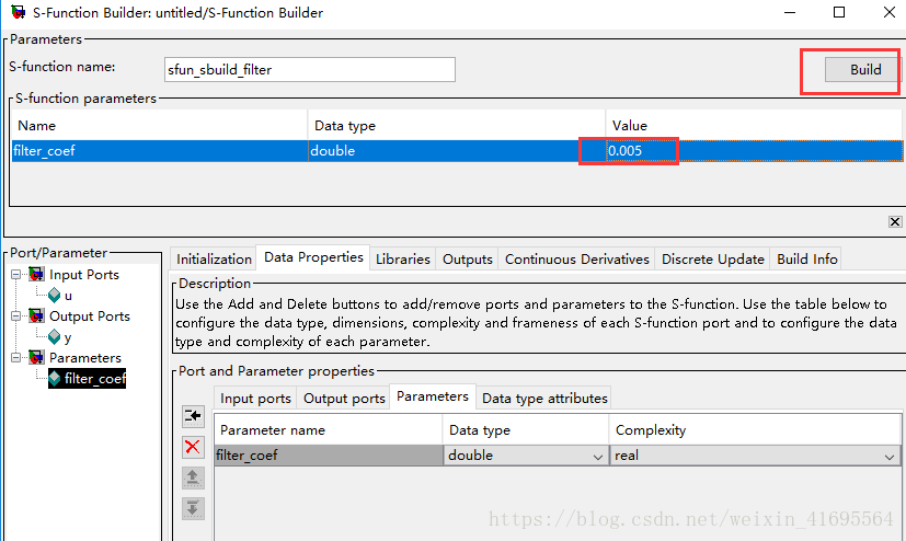 将参数filter_coef设置为double类型,其值设置为0.005,然后再单击右上角的Build按钮,如下: