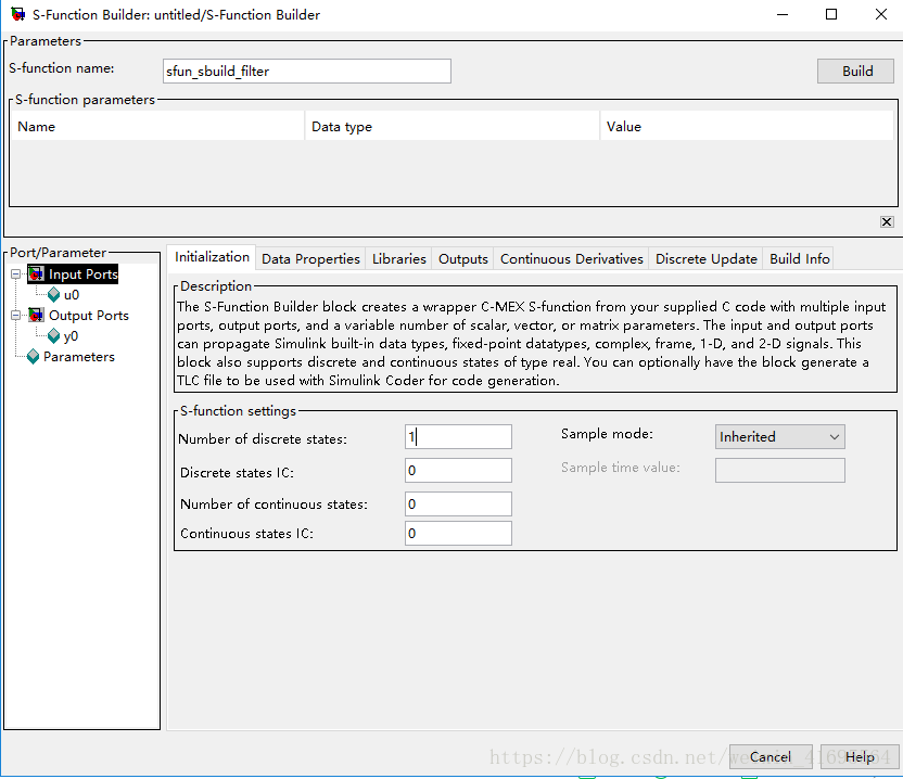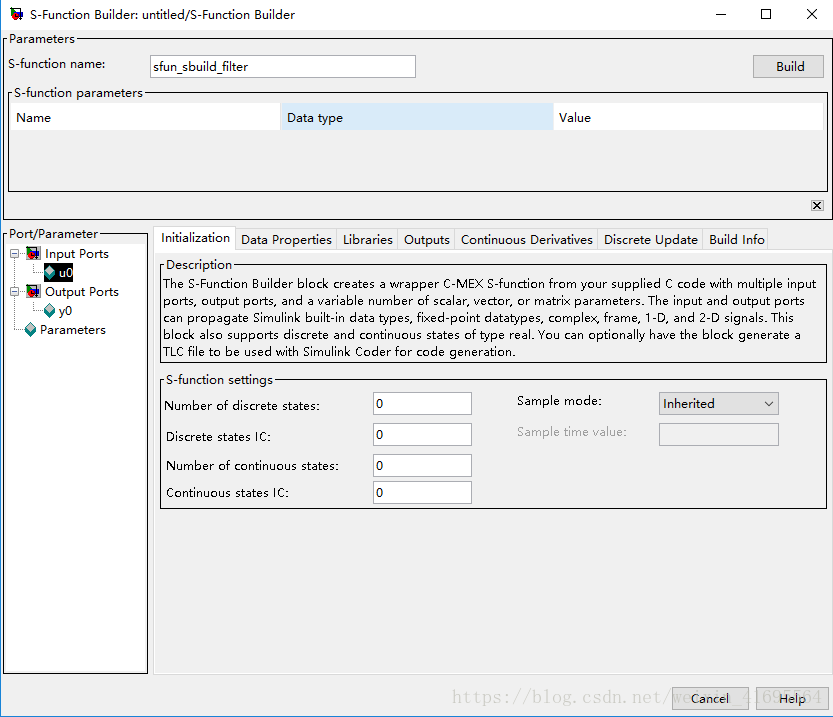 使用S-Function Builder对话框可以指定由S-Function Builder块构建的S函数的属性。 双击S-Function Builder模块图标,得到如下界面: