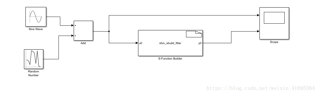 接下来我们构建一个简单的滤波程序 ,首先添加S-Function Builder模块以及相关的模块到模型中,如下所示:
