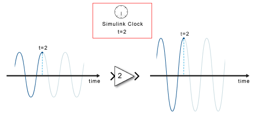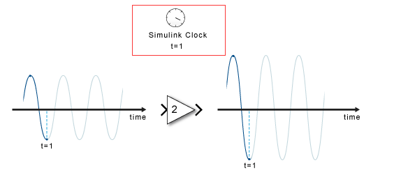 Simulink 的主要功能是对系统各个组件随时间流逝的行为变化进行仿真。简单来讲就是:采用一个时钟,按时间确定各个模块的仿真顺序,并在仿真过程中依次将在上一个模块图中计算得出的输出传播到下一个模块,直至最后一个模块。以扩音器为例。在每个时间步,Simulink 都必须计算正弦波的值,将其传播给扩音器,然后计算输出值。如图所示: