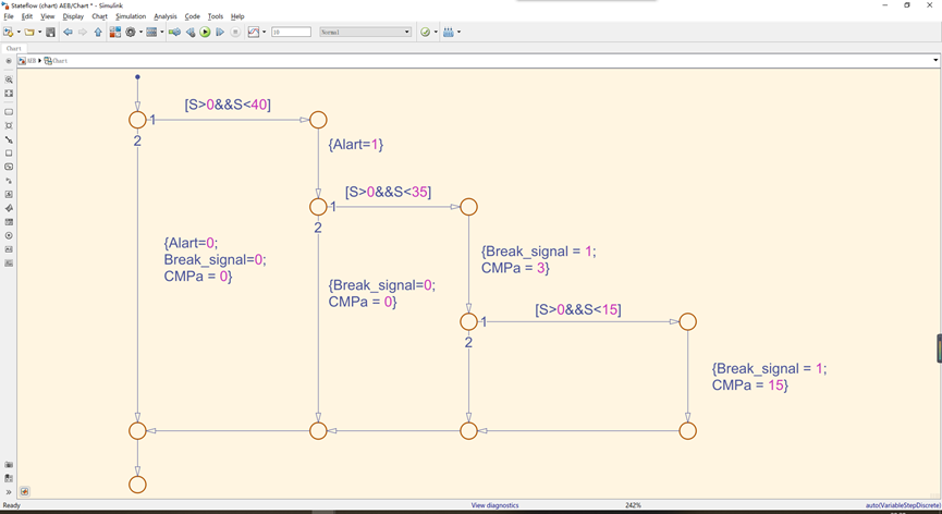 功能:控制算法逻辑车辆采集到传感器信号距离前方车辆位移距离本车40发出警告当距离达到35车辆进行小制动3MPa当距离为15时车辆紧急制动,制动压力为10MPa。