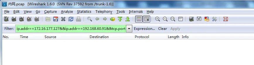 在终端A处抓包,搜索条件ip.addr==172.16.177.127&&ip.addr==192.168.60.91&&tcp.port==5555: