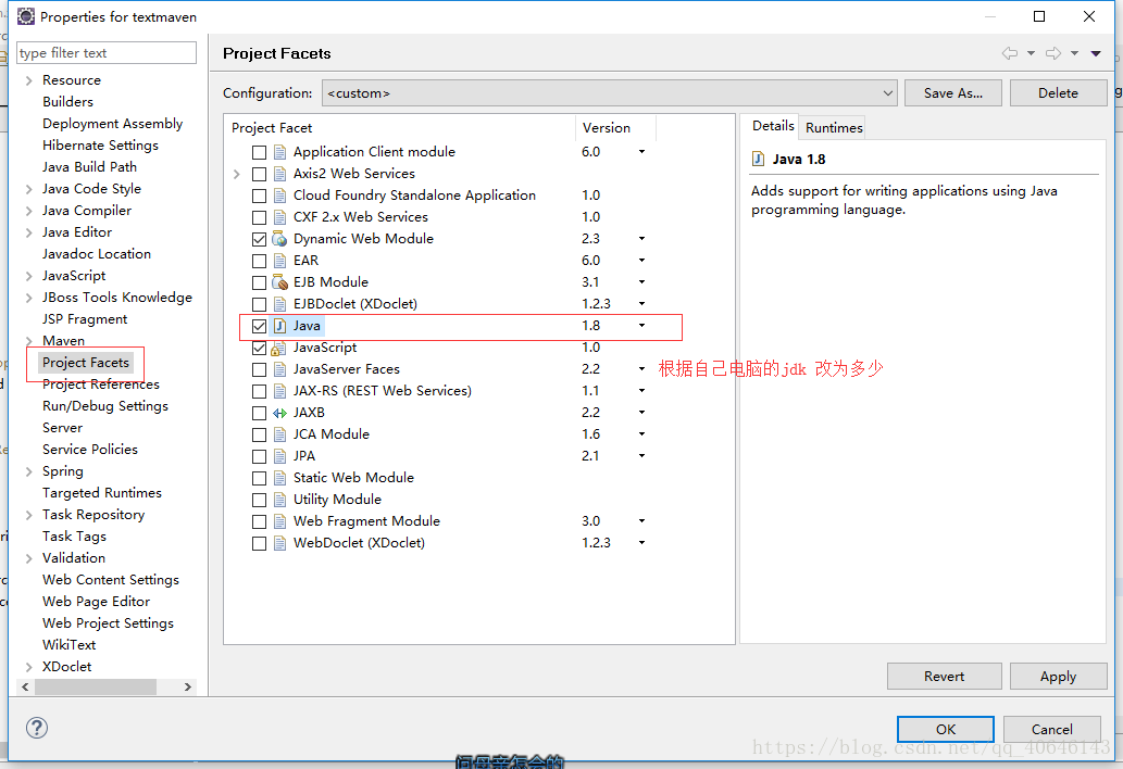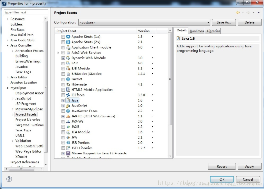 3、保证项目的Facet中Java版本不低于1.6,右键项目 > Properties > MyEclipse > Project Facets > Java,保证“Java”不低于1.6。