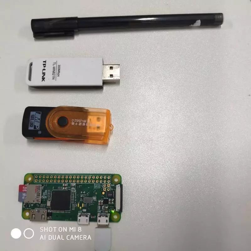 你可以看到,最上面是一根普通的黑色签字笔,接下来是一个即插即用型的外接 wifi 网卡,然后是一个 USB 读卡器,最底下的就是我们今天的主角 zero w。它真的超级小,有木有。真的是完美的诠释了那句“麻雀虽小,五脏俱全”的话。