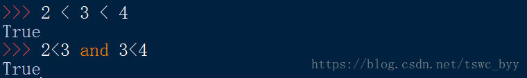 Python中支持多个数的比较,如2<3<4等价于2<3 and 3<4,结果返回true。但在其他语言中2<3<4是不合法的。