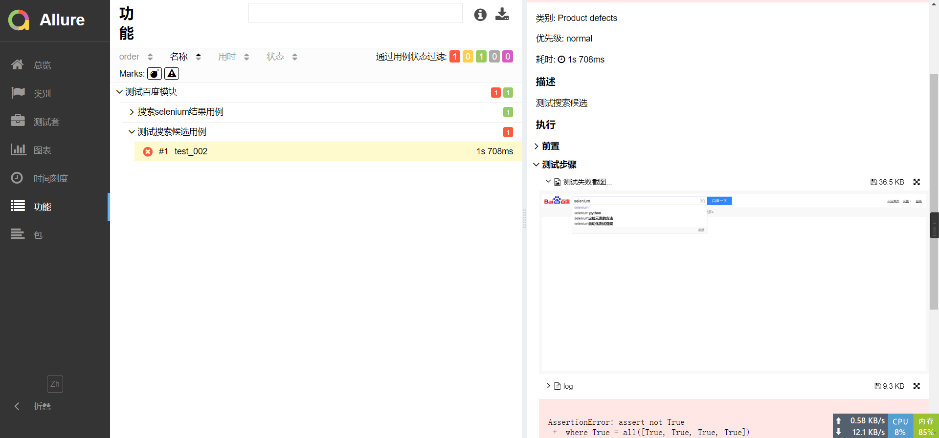 上面的用例全是运行成功的,没有错误和失败的,那么发生了错误怎么样在allure报告中生成错误截图呢,我们一起来看看。