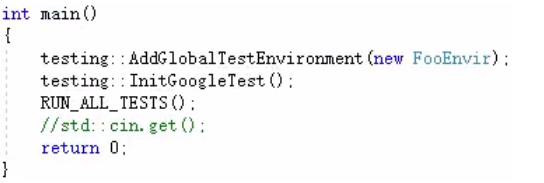 还需要在main函数中通过调用testing::AddGlobalTestEnvironment这个函数将事件挂进来,也就是说,我们可以写很多个这样的类,然后将他们的事件都挂上去,AddGlobalTestEnvironment这个函数要放在RUN_ALL_TEST之前。
