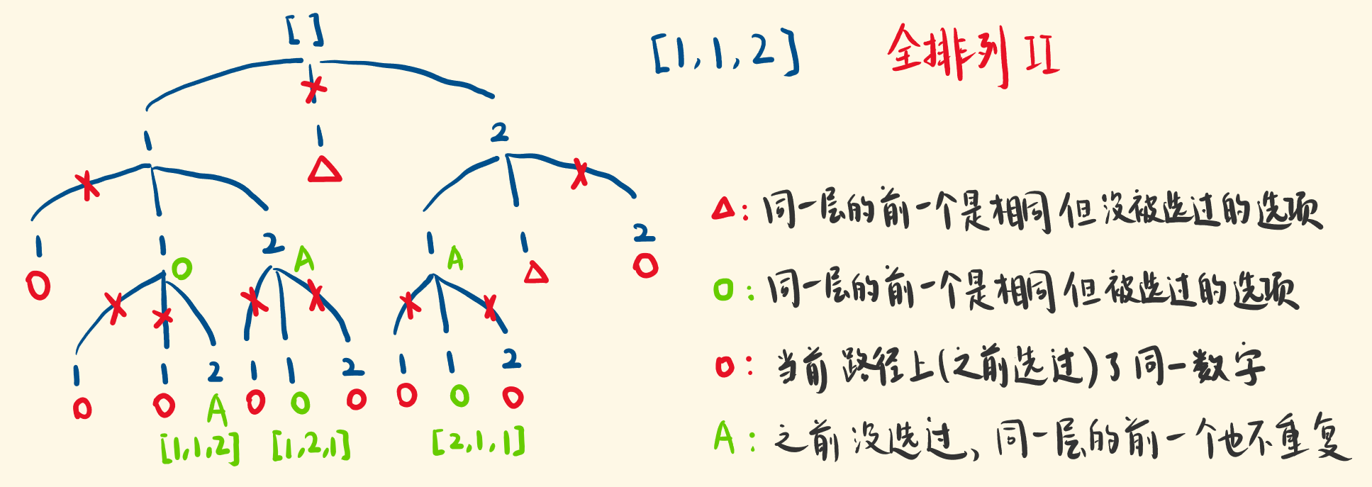 本题是求全排列,并且排列不能重复。我们用一个 vis数组维护一下,让每一条路线保证不重复选取元素,而对于每一层而言,需要判断相邻元素是否相同,相同的就没必要走了,例如下图中红色三角形部分。