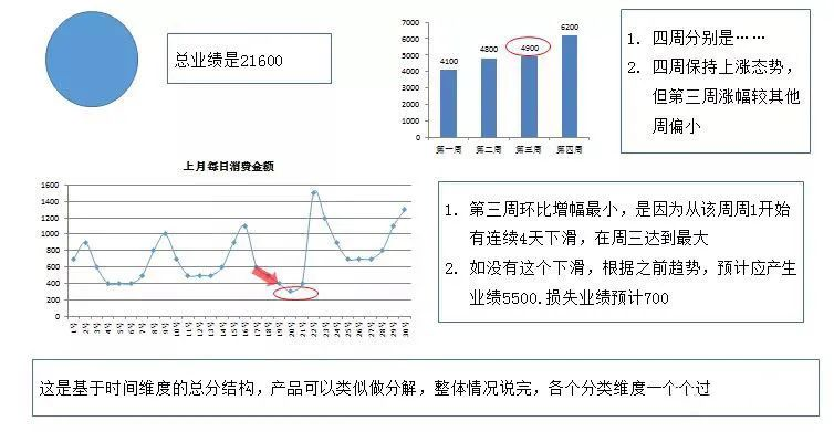 这里显然不止一个问题。因为有了分类维度,所以有了整体和部分的区别。我们不能像初级汇报时候那样丢一个“总业绩是XXX”交差。