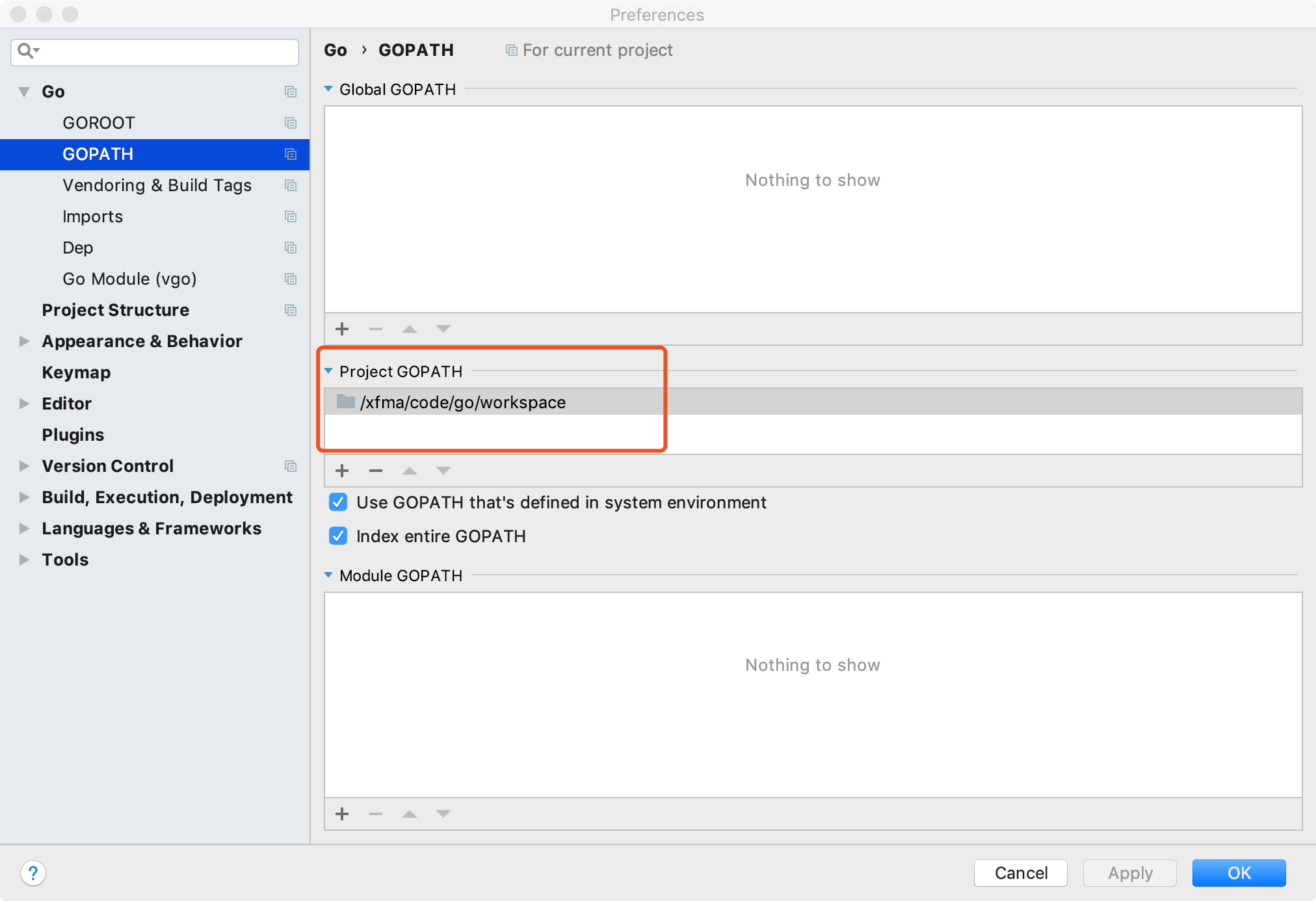 一般go代码都会放在src目录下,然后在分包开发。这时候需要设置GOPATH路径,如GOLAND中设置,把GOPATH路径设置为:/xfma/code/go/workspace 即为src的上级目录